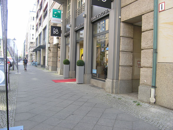 | |  Detailed view |  Designer plexiglass push-grips, external doors, Storkower Bogen Berlin, Door II |  Shop design, shelf system, Harley-Davidson, Bremen |
