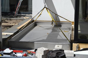 | |  Steel cabinet construction / St. Cobain for Showroom Berlin |  Granite plate before processing to tabling in an executive business office in the printing industry | |